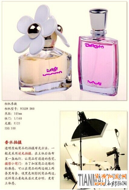 這張圖片里介紹了容易產(chǎn)生高光和鏡面反映的拍攝技巧:用一張黑色卡紙,中間挖個(gè)小洞,套在鏡頭上,還有用柔光紙圍在商品周圍,做全隔離的布光方法。