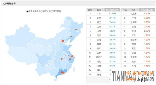 1、從買家的角度分析,以此產品為例,利用數據魔方的分析我們可以看出,這里的成交占比主要分布在沿海城市和個別中部發達的城市。所以,當我們在設置鉆展投放地域時,需要屏蔽西北西南等西部地區。