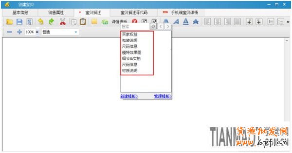 1、登陸淘寶助理—寶貝管理—創(chuàng)建寶貝—寶貝描述,選擇詳情模板: