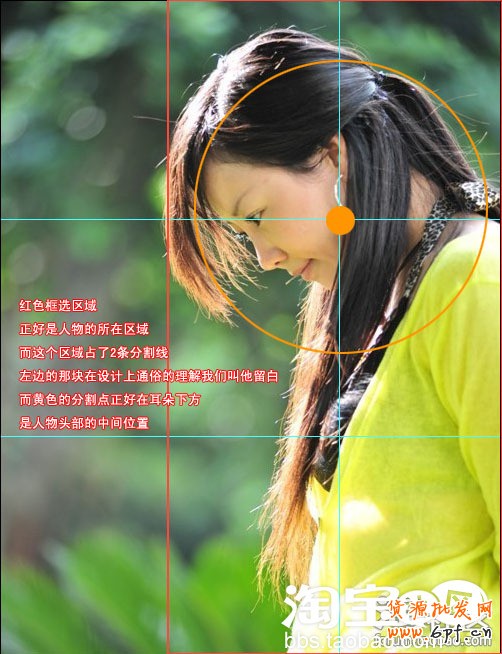 這個圖片之所以成功!大家看美女就是要突出的是臉!而他臉的中間是不是在我所標示的那個黃金分割點上!而這個相片是以高為主!那對比的時候就要左右對比!我們要在他們中間有所謂的留白!看美女的身子是不是占了我們剛才分割后3大格中間的2個左右大格呀!這就是對比!順便插一句!有些朋友拍出來的圖片根本都沒有對比!看他這個前面的人物很清晰!后面的背景是不是很模糊!而恰恰應了我們剛才說的重點在美女!而左邊剩下的一高格為了就是襯托右邊美女!因為美女是我們的視覺中心點!這樣圖看起來才有層次感!現在大家或許遇到一個難題!不一定每次拍出來的照片就是最好的!肯定要處理一下!那怎么能像上面的那個圖那樣的和諧那!看下圖!咱們還以哪位美女的圖為例子!