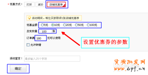 店鋪優(yōu)惠券方式:選擇優(yōu)惠金額,最少5元至100.填寫發(fā)行量、填寫訂單滿多少元可以使用,填寫活動宣言。點擊確定