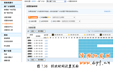 投放時間是指在你設置的特定投放時間內,你的寶貝才在淘寶網做推廣。如果不在投放時間內,你的寶貝將無法展示。淘寶三個流量高峰期是10:00—12:00,14:00—17:00,19:00—23:00,你可以以這個數據為標準進行設置。你也可以使用系統推薦的行業模板時間,它是根據每個行業的特性來設定的高流量時間段。時間段投放的最小單位是半小時,你可以預設一周的投放時間,如圖所示。