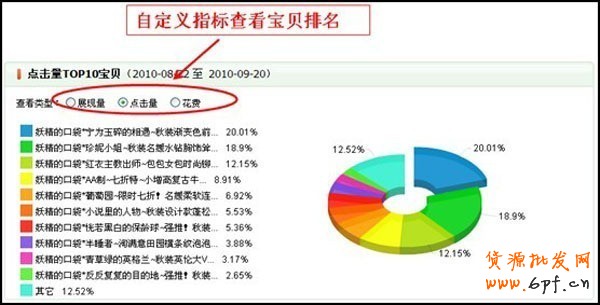 • (2) Top10寶貝 “TOP10寶貝”為用戶提供不同數據指標排行TOP10的寶貝。您可以自定義單選查看不同的數據指標。