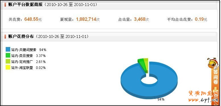 • (2) 賬戶花費分布您可以查看所選時段的總花費分別在“站內-關鍵詞搜索、站內-定向搜索、站內-類目搜索”、站外—淘寶聯盟的分布。