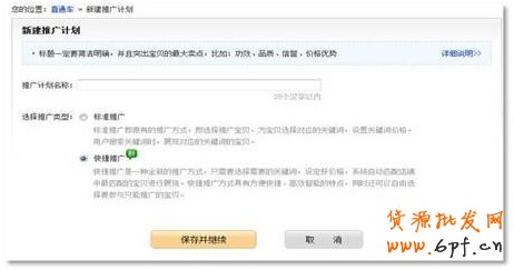 進入推廣計劃新建頁面,選擇“快捷推廣”,點擊“保存并繼續”按鈕