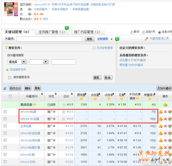 當一款寶貝的總體點擊率很高,里面的所有關鍵詞質量得分都很高。我用的方法是利用關鍵詞的點擊率,提升定向的質量得分。下面看圖: