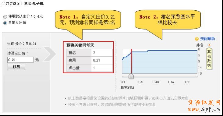 二、出價技巧 展現位置是根據關鍵詞的質量得分和出價綜合得出的,既然知道了質量得分,把握好出價就至 關重要了。直通車的展現位置在搜索頁面右側8個展示位及下方5個展示位,按照消費者的點擊 習慣,一般在右側2~5位、下方2~4位的點擊量最高,這在我之前的文章中也提到過,參考 這篇文章(【理論+實踐】第1名一定比第2名好嗎 —— 談淘寶直通車關鍵詞排名位置), 因此我們可以根據出價來改變展示位使我們的寶貝處在這些位置上,但需量力而出。 我們要用最少的錢達到最好的效果,下面是我總結出的一些出價技巧,可供參考。 1、出價范圍 量力而為,太高的價格盡量少出,做到勤儉。出價范圍控制在0.2~0.8元。 2、使用默認出價 推薦一款產品的關鍵詞相對來說都較多,建議先設默認出價,如果都用自定義出價將會大大 增加工作量。 3、主推質量得分高及展現量高的 質量得分高且展現量高的說明我們的產品相關性較好及購買意愿的客戶較多,同時轉化率也 相對會更高,因此有必要主推。同樣使得花更少的錢得到更好的推廣效果。 4、排名預覽圖水平線比較長 當出價時預測排名的預覽圖水平線比較長時,盡量選擇在圖形往下折的那個點;若該關鍵詞 的出價數較少,且1、2名的水平線較長,可選擇在3、4名,這樣可以節省不少的錢哦,且效 果是一樣的。 例如同樣是“章魚丸子機”這個關鍵詞,默認出價是0.4元,排名是第2名;而我們自定義 價0.21元,排名同樣是第2名。