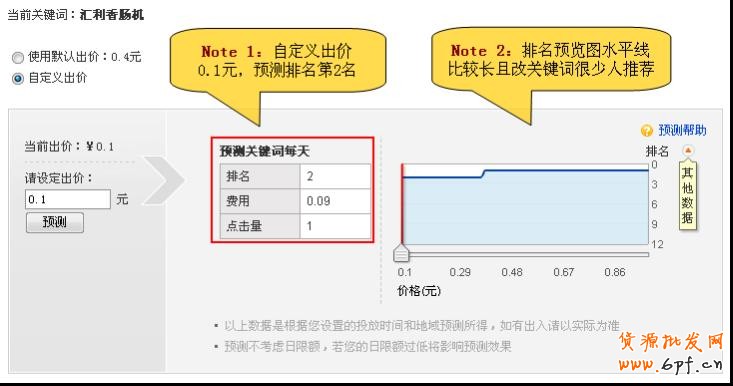 5、該關鍵詞很少人推薦的 有時我們選擇的關鍵詞是比較少商家推薦的,但搜索次數不低的,排名第1與第2的價格會相 差很遠哦,如此我們就沒有必要出價排名第一,出價排名第二同樣可以達到一樣的效果,同 時還能節省不少的推廣費用哦。 例如同樣是“匯利香腸機”這個關鍵詞,默認出價是0.4元,排名是第1名;而我們自定義價 低于0.1元,排名是第2名,效果是一樣的。