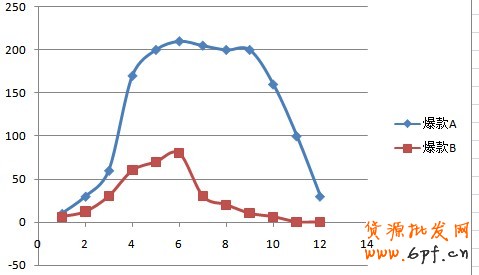 需要補充的是,除了打造爆款產品除了最初做好搜索優化工作之外;爆款產品的維護和運營也是相當重要的。當時選了2款爆款產品,數據統計圖如下(僅供參考):(X軸表示時間,以一周為單位;Y軸表示銷量,以件為單位)