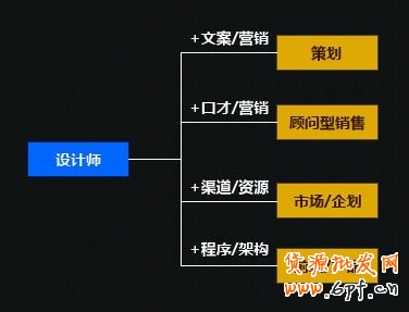 文字功底扎實,具備營銷思路的可以轉型做策劃;口才一流,又掌握營銷手段的,可以轉型做顧問型銷售;有供應商和媒介資源的可以轉型做市場或者企劃;有一定程序開發能力的或者前端架構的,可以轉型產品經理;還有更多種不同的組合,而決定它的是設計師所擁有的知識。