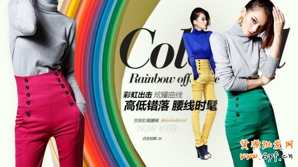 以下圖為例,ciaodafanfan 是個主打歐美風的店鋪,這張推新品的首焦圖,其洋紅和綠色形成了絕佳的視覺沖突,而黃色作為暖色系的代表色和洋紅色構成了一個補充,同時又巧妙地協調了洋紅與綠的巨大色系差,最后設計師通過構圖的平衡和人眼從左向右看的視覺習慣,將受眾的眼神牢牢的鎖定在了洋紅色的高腰褲上,將畫面所要強調的雙排扣和高腰的特點放到最大。