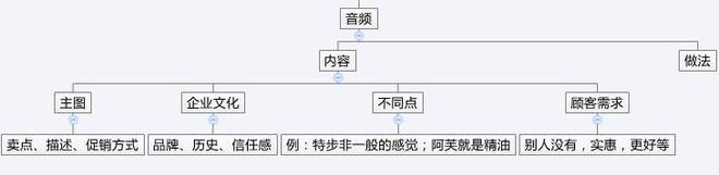 手機音頻的內(nèi)容主要可以從顧客想要什么、產(chǎn)品的利益點、我比別人不一樣的地方等來充分發(fā)揮,具體可以從下圖來延伸。
