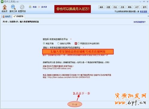 如復制淘寶店鋪的商品,請輸入店鋪地址,然后點擊“下一步”,如下圖所示
