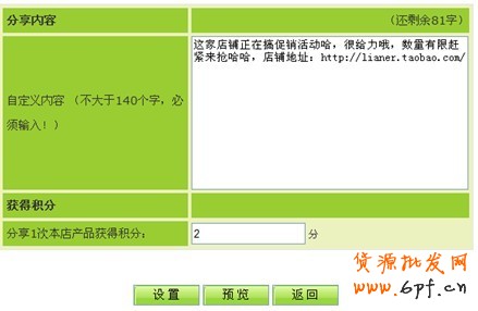 若是以打造爆款為主,在大促前此款寶貝就需要預熱,成為店鋪引流款或暢銷款,等大促時再設置醒目、刺激購買的宣傳標語和心動價格,并在大促過程中實時更新直播爆款商品銷售狀態。再以吸引新客戶為例,著重點應放在如何將訪客轉化為店鋪會員,諸如滿多少贈送VIP權限,享有再次購買商品幾折的權利。或是一些小招數比如“包郵卡”將新用戶轉化為忠實用戶,下次該用戶再次購買時第一反應是已經付費的“包郵卡”店鋪。當然,老客戶對一些成熟的店鋪賣家更為重要,開發一個新客戶的成本和維護8個老客戶的成本相抵。培育老客戶,降低推廣成本,銷售量穩定增長是通往大賣家的必經之路。比如可以用工具“促銷百寶箱”的店鋪積分系統來維系老客戶,將老客戶的每一次進店后的消費行為和分享推廣行為轉化為積分的動力,這個積分可以在老客戶二次購買的時候抵現使用,刺激老客戶的回頭購買和幫助店鋪主動做微博分享推廣。