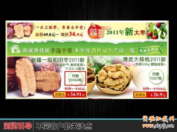 如果我們推薦的產品針對的是新客戶和老客戶這兩大消費群體,就要在視覺設計上同時強化銷量和折扣這兩個信息,迎合他們的興趣點,引導其瀏覽頁面。