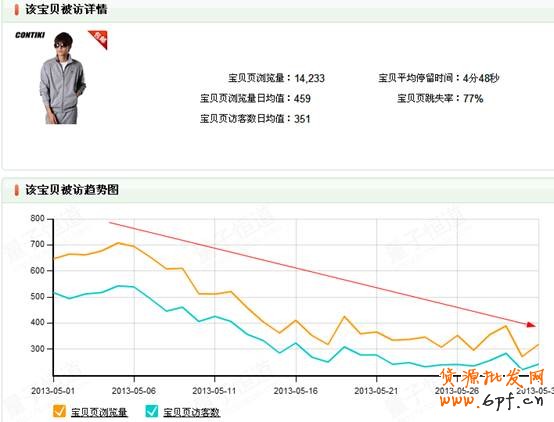 該寶貝流量雖然偏低,但是寶貝的跳失率相對兩款主推寶貝較低,訪客停留時間也是比較長的,所以將該款寶貝重點選取為秋款預熱寶貝。