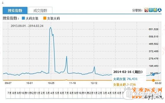 這個(gè)是用淘寶指數(shù)得出的結(jié)果,在搜“大碼 女裝”和“女裝 大碼”這兩個(gè)關(guān)鍵詞的時(shí)候,大家可看到,雖然關(guān)鍵詞的順序顛倒了,但是搜索量是一樣的??墒钱?dāng)搜索“大碼女裝”和“女裝大碼”的時(shí)候,搜索量卻足足相差了幾十多倍。
