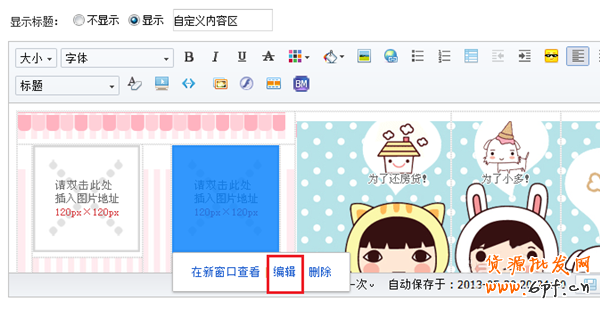 a 單擊模版中要插入寶貝圖片的部分(如圖藍色部分),然后選擇“編輯”(紅框)。如下圖所示