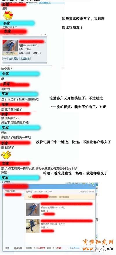 就比如說之前那些沒有聊天就直接下單的客戶,我一般等到訂單確定之后,我看旺旺如果在線的話,我就會主動去給他們說一些話,比如 說“親,您的訂單已經收到了,下午五點之前我們統一安排發貨”,或者下午五點之后直接下單的客戶我都會留言給他們“親,您的訂單收到了,由于時間玩了,明 天給您發貨,謝謝您的支持”等等這之類的話語,如果客戶比較和藹的話,一般都會回復我們,這樣子我們與客戶之間的感情就更進一步了。這樣子得到的結果就是,客戶對我們的寶貝非常滿意,會及時來給我們好評,而且會耐心的寫評語,其實這就是我們想要的,得到客戶的認可,并非是一個個訂單,客戶收到之后就等待默認好評了,如果前期工作做好了,那么,如果出現任何的售后問題,我們的客戶對我們就不會惡言相對,處理起來比較方便了。其實這點主動營銷也是我們與客戶溝通的最大好好處,很有可能讓一個一次性的客戶,成為我們的老客戶。