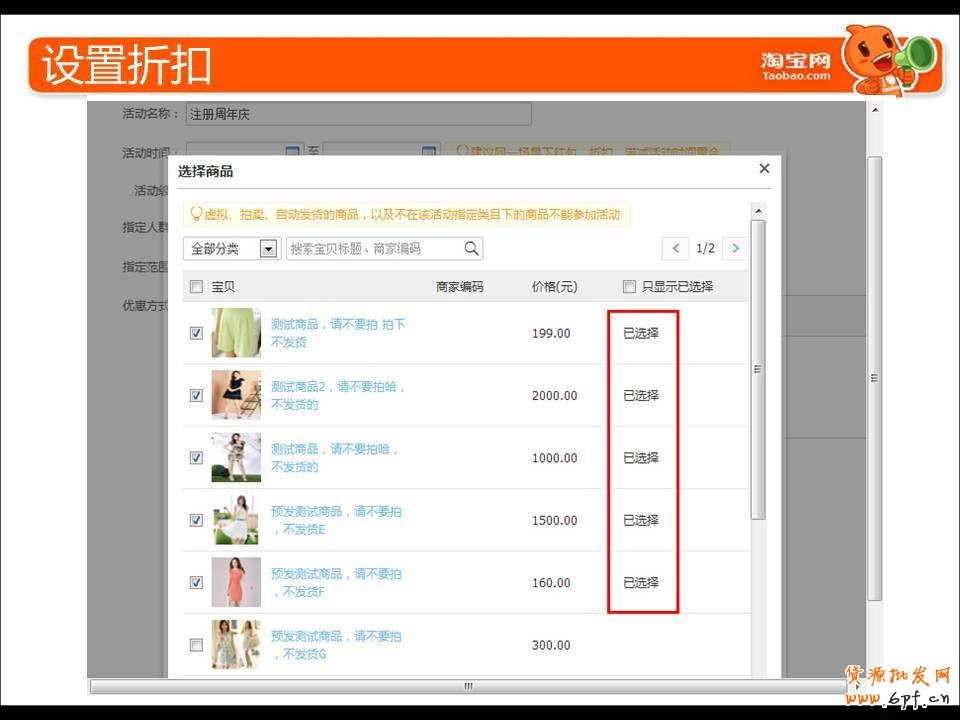 e、店鋪折扣設置如下:選擇設置折扣的商品:至少5件商品,多多益善!