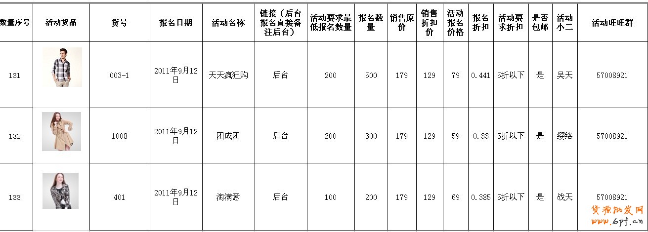 亂寫的,大家別笑我 【聲明】本文以淘寶所謂的資源和暗箱操作全無關(guān)系,想看所謂小二資源的請繞道而行,本文介紹我自己團(tuán)隊真真實實,通過正規(guī)活動報名的方式操作淘寶活動的過程。 【戰(zhàn)績】2011年12月1日-2012年1月10日銷售額:15W 參加活動:總共9個 成本投入:活動專員一人,成本3000元/月 2011年小二資源被炒到一種神話的地步,經(jīng)歷了半年的挖資源無果之后,開始思考自己操作活動報名,流程如下: 1、產(chǎn)品選擇:遵循淘寶1.2.7規(guī)則,我的店鋪內(nèi)一般多會有3-5個款專門用于活動報名,制作一個預(yù)報活動表格,請千萬不要依賴于自己的記憶,因為你下面要做的一件事情是流水線量產(chǎn)工作,比的就是速度比的就是效率。