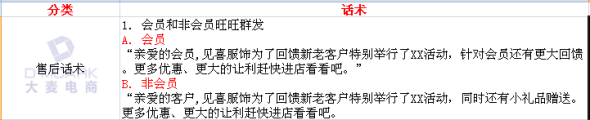 ③ 售后話(huà)術(shù):A.老客戶(hù)關(guān)系的維護(hù)(包括會(huì)員和非會(huì)員的旺旺群發(fā),短信營(yíng)銷(xiāo))B.退換貨問(wèn)題(包括商品問(wèn)題,物流問(wèn)題,客戶(hù)問(wèn)題)C.投訴或者中差評(píng)問(wèn)題(包括商品問(wèn)題,客服問(wèn)題,物流問(wèn)題,客戶(hù)問(wèn)題)例如: