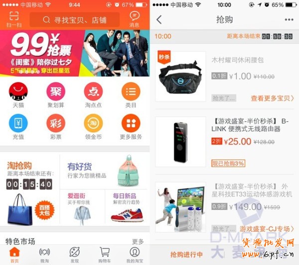 淘搶購是免費報名的活動,每天更換展現寶貝,展示位置長期以來占據了客戶端首屏左下模塊,日均UV高達200萬,以整點秒殺和搶購的形式吸引買家,上圖可以看到一款10點秒殺的休閑腰包一上線就被搶購一空,除了秒殺商品,另外的是普通搶購商品,以“已被搶購百分之多少”的形式展現剩余庫存,容易引起消費者對商品形成瘋搶效應。
