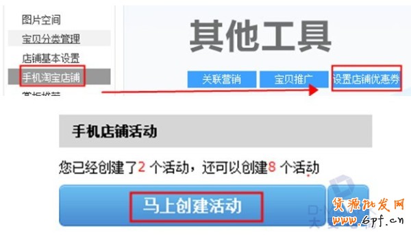 點開手機淘寶店鋪,在“其他工具”里面“設置店鋪優惠券”,點擊“馬上創建活動”;