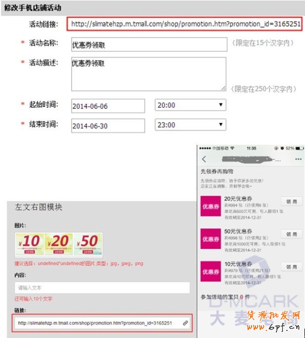 只需要填寫活動名稱、持續時間和上傳活動宣傳圖片,在店鋪優惠券一欄選擇“立刻設定”就會自動跳出優惠券的選擇框,里面的優惠券則都是之前已經設置好的優惠券。值得一提的是,每個無線端優惠券的活動都只能最多選擇3種不同額度的優惠券,最后點擊創建完成。點擊編輯已經創建的優惠券活動,復制頂端的活動鏈接,粘貼到一陽指優惠券模塊的鏈接上,保存發布就大功告成了!