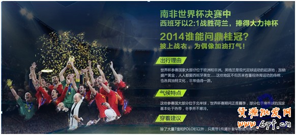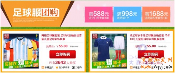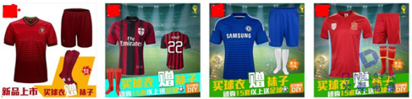 雖然,在4月份的時候我們從天貓官方活動招商的信息上就已經得知天貓將會在05月28日(00:00:00)~05月30日(23:59:59)這個期間進行2014天貓年中大促?第一波?電器城暑促,但是,此時我們并不能確定接下將會有第二波、第三波、以及后來的第四波等年中大促的專題活動,更別提能確定第二波、第三波、第四波每個專題的招商類目了。當第二波·囤貨專場的招商信息出來后,我們馬上結合店鋪主營的產品進行了相關的活動策劃工作安排——店內的產品主要以足球服、籃球服、田徑服為主,與世界杯賽事關聯性較高,尤其是店內的足球服和足球襪等產品。