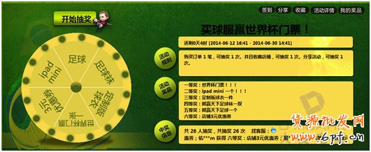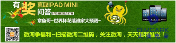 既然是有玩法的活動,當然是少不了互動活動了——在活動預熱期間,店鋪設計了為題“觀戰(zhàn)、拿獎、樣樣不誤”的大轉盤抽獎活動,獎品設置更是相當誘人:足球、足球襪定制版球衣、世界杯門票1張、3元店鋪優(yōu)惠券、ipad mini等。由于是由后臺設置獎項和中獎概率的,所以不必擔心商家會虧本;同時,它可以實現實時公布獲獎名單及中獎明細,能有效增強活動的真實性和趣味。除了在PC端實現互動,店鋪還通過微淘在5月28日到6月27日期間,在無線端以微淘發(fā)帖方式,進行有獎問答——“章魚哥-世界杯花落誰家大預測”,并且在PC端的店鋪首頁以banner形式展示出來,突出“章魚哥有獎問答”的活動,營造活動氣氛。