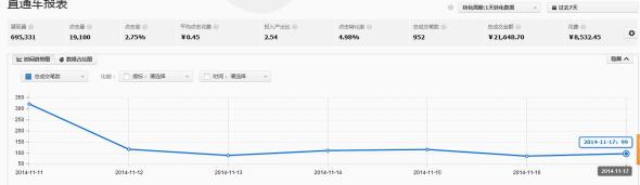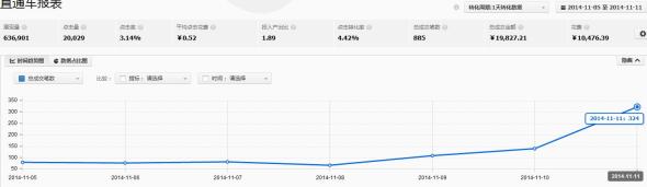 雙11當(dāng)天全店成交用戶數(shù)1336筆,直通車成交324筆。約占到了全店的1/3。雖然對(duì)于這個(gè)結(jié)果我還不是很滿意,但是至少,這個(gè)店鋪每天直通車可以帶來(lái)的單子已經(jīng)達(dá)成了掌柜的期望,而且還有點(diǎn)賣超。過了雙十一之后這幾天,一直是出于“后雙十一”時(shí)代,這個(gè)時(shí)候買家的購(gòu)買力普遍下降,已經(jīng)沒有那么大的購(gòu)買需求,而我們的店鋪依然是高歌猛進(jìn),成交筆數(shù)每天約在100筆左右。