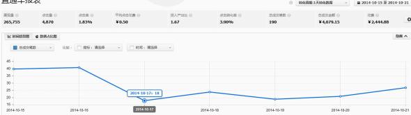 第一周主要是對(duì)店鋪的熟悉和契合度的掌控;關(guān)鍵性的轉(zhuǎn)折就在第二周,從第二周開始,也就是十一假期剛過,淘寶的買家購(gòu)買力正在逐步的恢復(fù),我們的力度也開始加大;花費(fèi)開始提升,并且成交筆數(shù)也在不停的攀升;第二周的最后一天,也就是14號(hào),我們的日成交量已經(jīng)達(dá)到了51筆,這個(gè)數(shù)字比之前翻了3倍多,掌柜開始對(duì)我們有了基礎(chǔ)的信任,他認(rèn)為我們可以把他的店做起來(lái),因?yàn)檫@個(gè)時(shí)間段,我們的數(shù)據(jù)一直在提升,成交筆數(shù)開始翻翻,自然就有了更深的探討。