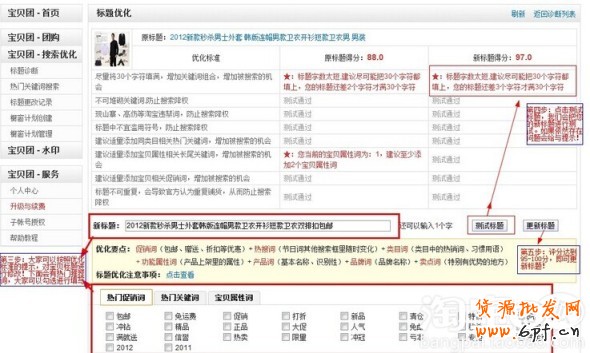 第三步:大家可以按照優化標準的提示,對寶貝標題進行修改,下面會有熱門測供選擇;