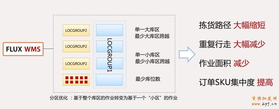 波次生成是為了多個(gè)訂單合并揀貨,提高效率,減少重復(fù)行走。波次優(yōu)化,擴(kuò)進(jìn)一步提高后續(xù)揀貨作業(yè)的效率。以下是針對(duì)邊揀邊分作業(yè)的分區(qū)優(yōu)化圖示。經(jīng)過優(yōu)化,同一波次的訂單揀選作業(yè)控制在較小作業(yè)區(qū)域。