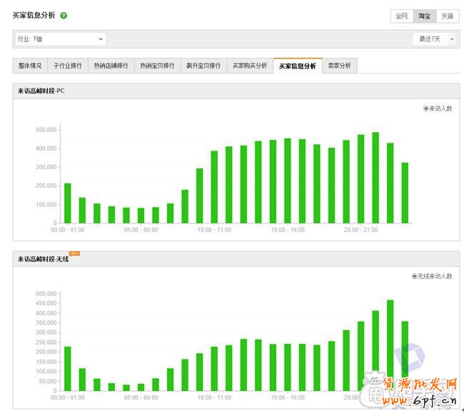從條形圖中可以看到:男裝T恤類目的PC端訪客高峰期是10:00-23:00,其中最低峰是18:00-19:00,無線端的高峰期也差不多,但是規律不一樣,晚上20:00-23:00這段時間的流量特別大,那么我們可以分別針對PC端和無線端去設置,比如一些主打PC端的寶貝設置成晚上22:00下架,而主打無線端的寶貝設置成23:00下架。如果寶貝的銷量比較高,可以挑選最大的流量高峰,如PC端的15:00-17:00,晚上20:00-23:00。