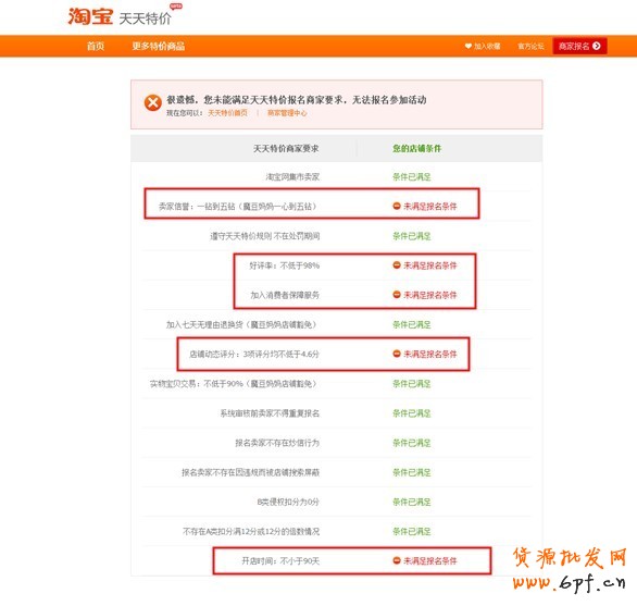 答:說明您各項資質還未達到天天特價平臺的要求,具體可以根據反饋結果進行店鋪優化以后再來報名。