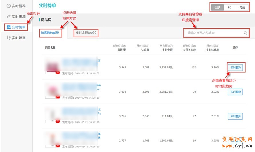 主要提供商品TOP50榜單及實時催費寶,商品TOP50榜單主要根據支付金額、訪客數兩種排序下的前50商品列表,并且還提供搜索功能,支持查詢你想知道的商品的實時效果數據。