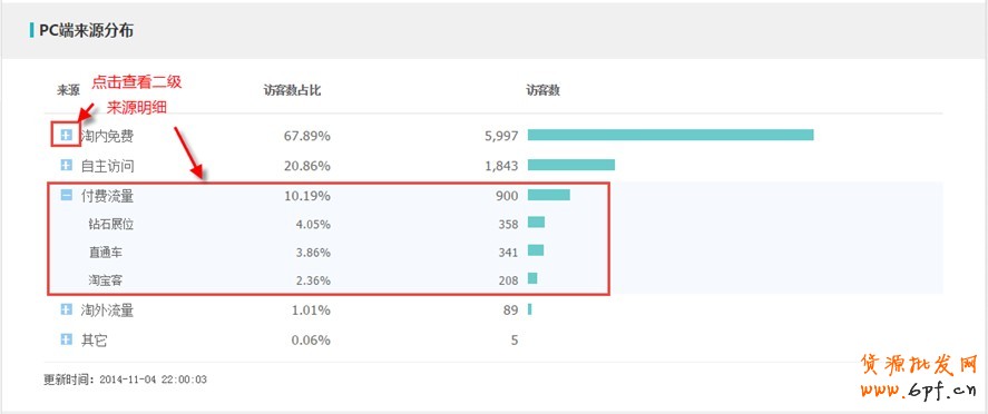 2015.2.5升級新增了原量子來源分析收費功能,PC端來源分布提供來源明細TOP100,針對淘寶搜索、天貓搜索、直通車,實時提供TOP100訪客的明細關鍵詞,其他細分來源的提供TOP100明細來源url,部分來源不支持細分。無線端來源分布暫不支持細分。