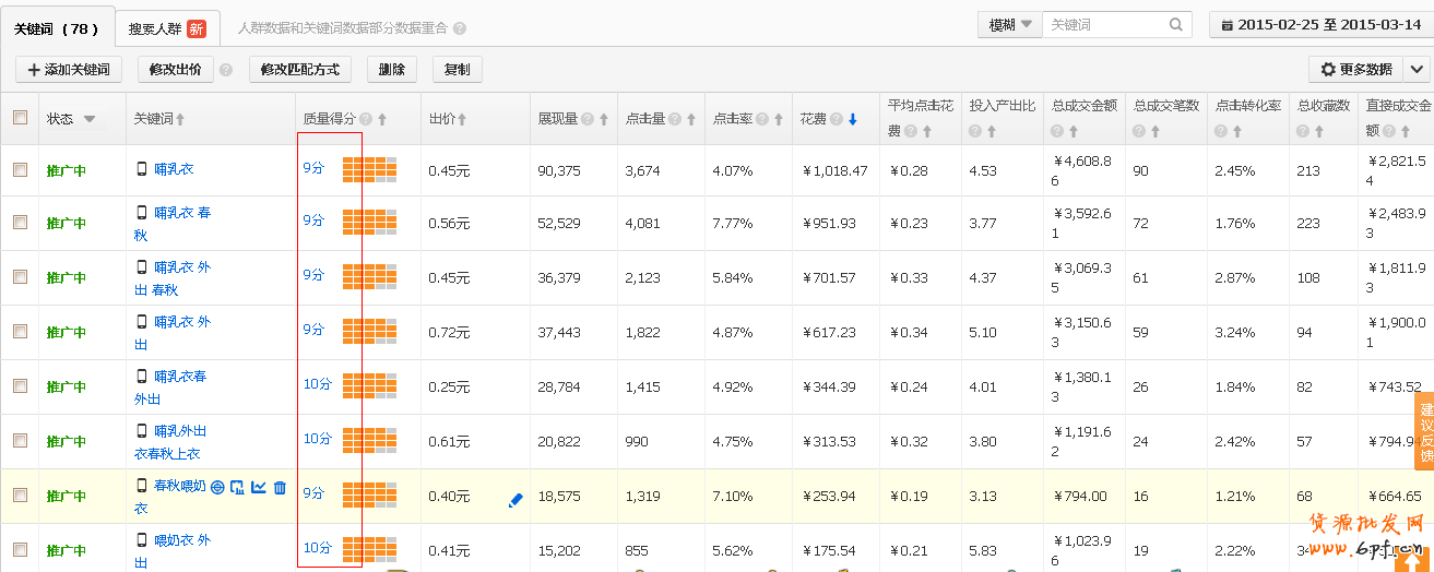 由于春節(jié)期間我們也進行了投放,所以寶貝的關(guān)鍵詞的質(zhì)量得分都比較高,此時我們要加大消耗,還是比較有優(yōu)勢的。