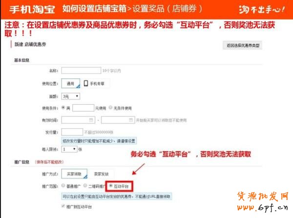 獎品如果是店鋪優(yōu)惠券或者商品優(yōu)惠券,都需要到營銷平臺設置新的券,且在設置券的時候,必須勾選“互動平臺”,否則獎池無法獲??;獎品如果是店鋪優(yōu)惠券或者商品優(yōu)惠券,都需要到營銷平臺設置新的券,且在設置券的時候,必須勾選“互動平臺”,否則獎池無法獲取。