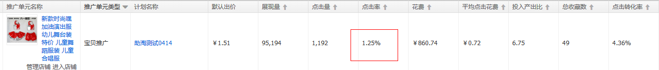 可以看到寶貝的點擊率都非常高,PPC也控制的比較好。因為定向和站外投放的開啟會影響點擊率,所以沒有開啟定向,而站外的話因為前期沒有測試,所以雖然知道站外的點擊率比較低但還是先低消耗帶著。