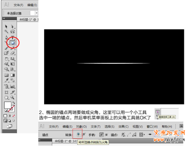 2、橢圓的兩端要做成尖角,這里可以用一個小工具選中一端的錨點,然后單機菜單面板上的尖角工具就OK了。