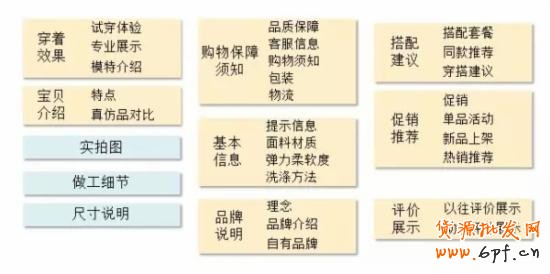 2、按照11個模塊和顧客反饋回來的信息,最終得出下面的結論為評價展示最高,做工細節、實拍圖、尺寸信息最追其后,其余就是模特的穿著效果、寶貝介紹等等。
