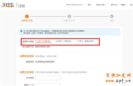 3.如下圖填寫好支付密碼以及個人身份證信息。注意:支付寶實名認證有三種類型分別為:個人賬號、企業賬號、海外個人賬號,目前我們就演示一下個人賬號的實名認證所以我們選擇了個人賬戶認證