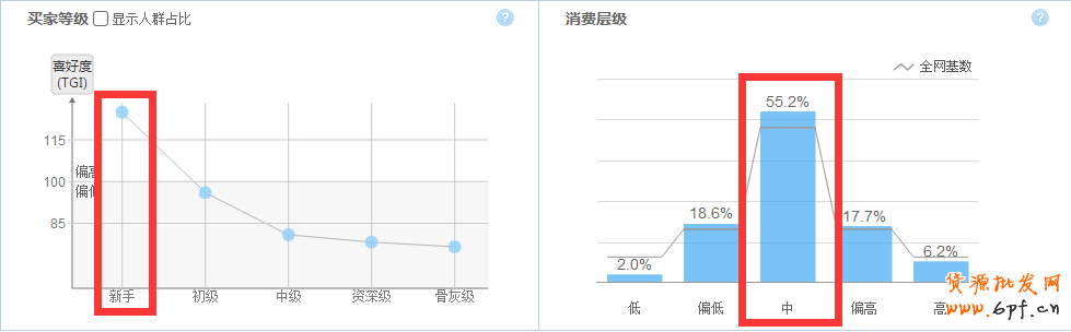 人群細分情況,主要是18-24、25-29的男性,女性占比要少一些。買家等級以及消費層級主要是中等消費的新手。