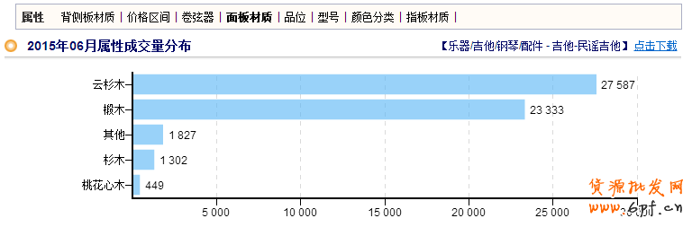 從生意經中,吉他這個類目屬性成交量分布,可以看到背側板的材質為椴木的成交分布量是最高的,面板的材質為云衫木的成交分布量是最高的,其次是椴木,而指板的材質為玫瑰木的成交分布量是最高的,所以在吉他制作材質選擇的時候,背側板、面板、指板的材質以成交量最高的來進行選擇。