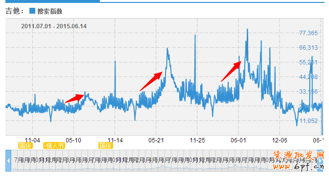 通過對笛子、吉他、塤這3個類目的搜索指數的對比來看,可以看到吉他的搜索指數是遠高于另外2個的,說明吉他的市場需要還是蠻大的。
