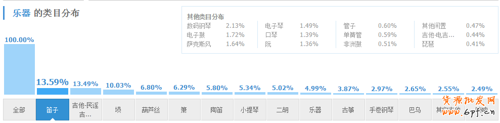 首先通過淘寶指數,咱們可以了解到樂器這個行業的類目分類情況,笛子、吉他、塤這3個,已經占了整個行業的37%,通過查詢這3個搜索指數情況,笛子一年的搜索指數還是比較平穩的,吉他是在暑假6、7、8這幾個月搜索指數比較好,塤是上半年階段搜索指數要好一些。所以不同時間段,樂器行業也都有不同要推廣的寶貝。