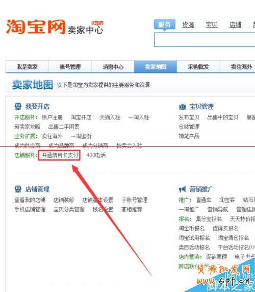 4、打開賣家地圖之后,我們點擊店鋪服務那里的“開通信用卡支付” 如圖